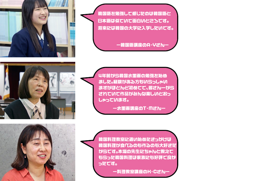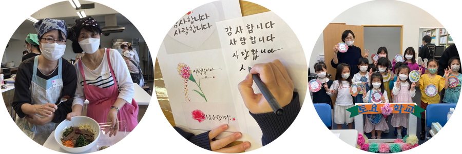 韓国料理教室、韓国の歴史講座、伝統踊り講座、韓国水墨画講座、韓日読書講座、子供の韓国語講座など