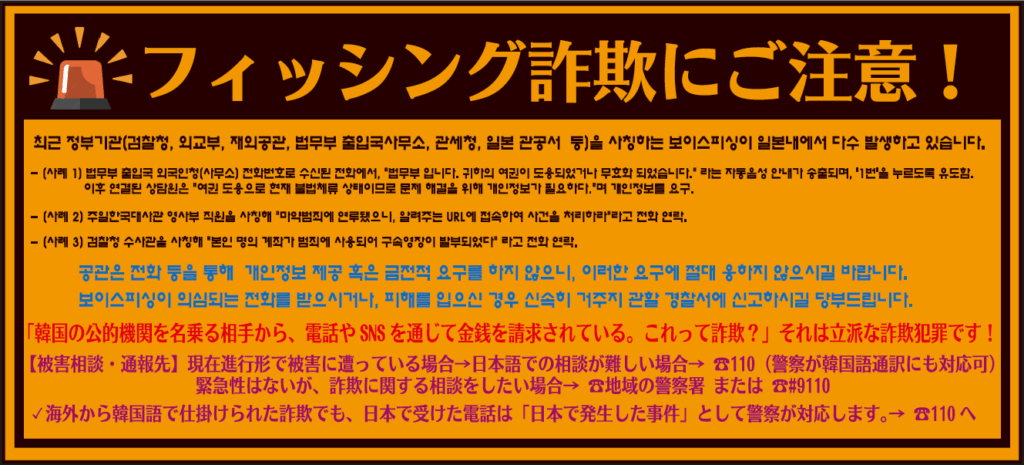 最近、在日韓国人を対象に韓国の法務部(法務省)を名乗る詐欺電話が多発しています。