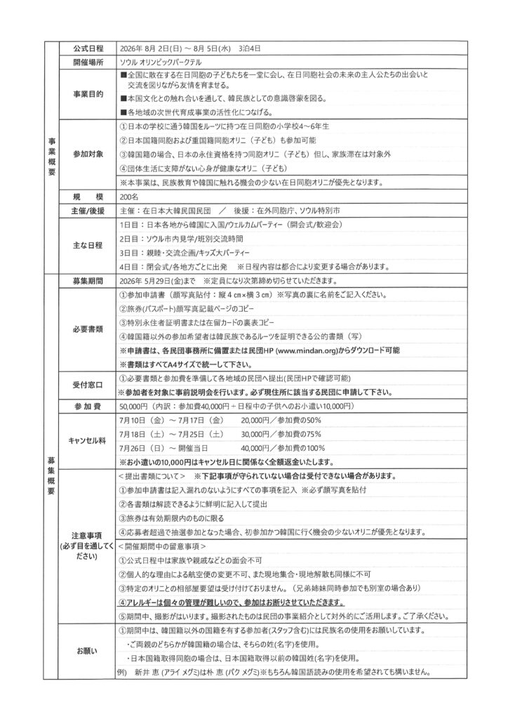 🌻 在日同胞 オリニジャンボリー2026 開催のお知らせ